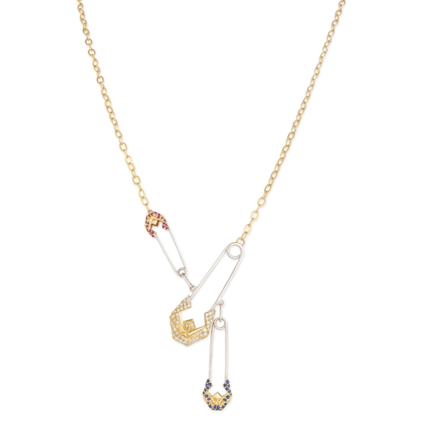 Tribute safety pin design necklace, 18kt yellow gold, set with brilliant-cut white diamond; with round-cut ruby and blue sapphire